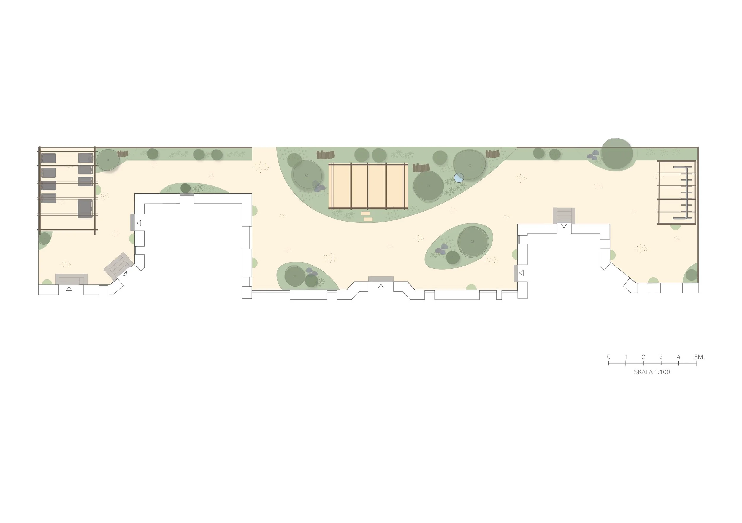 I den smalle Østerbro-baggård på knap 250 m2 har jeg lagt en serie af ovale plantebede helt og delvist ind i gårdrummet. Ovalerne skaber rum og stiforløb med organiske former og plads til funktioner som renovation, ophold og cykelparkering. De runde former bløder gårdrummets mange lige linjer og rette vinkler op og tilføjer stemning og en følelse af, at her er tale om et særligt sted.